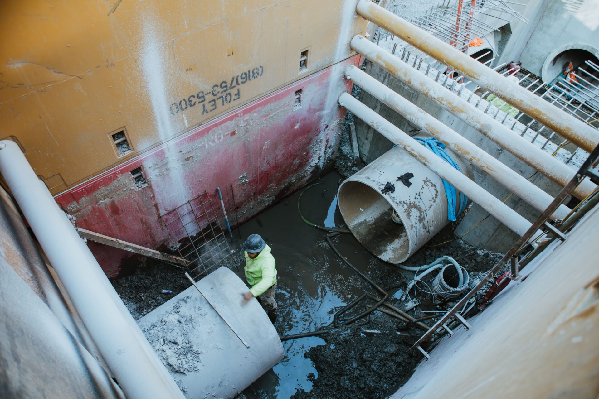 To accommodate the larger pipes, the team had to dig 35 feet into the ground to lay the 3,500 linear feet of pipe. During the excavation, the team also assembled new precast manholes and a cast-in-place structure.
